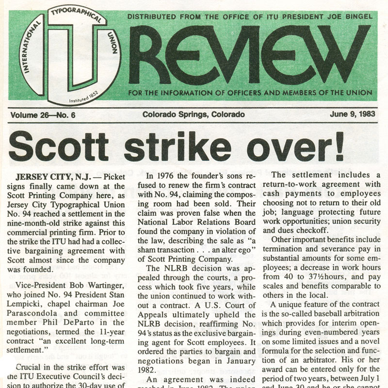 The seemingly endless strike was settled soon thereafter. A front-page headline in the June 1983 edition of the ITU Review, the international union's newspaper, announced: "Scott strike over!"