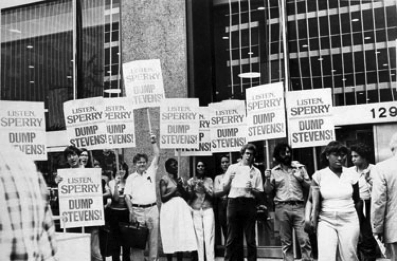 Protesting Sperry Corporation's ties to JP Stevens (Top Left). Protesters include Sam Hirsch and Millie Rodriguez who later became Corporate Campaign, Inc. staffers (Top Right). Ed Allen and Ray Rogers discussing "Listen Sperry; Dump Stevens" strategy (Bottom Left). George Altomare, UFT; Crystal Lee Sutton (The Real "Norma Rae"), and AFL-CIO Regional Director Mike Mann (Bottom Right).