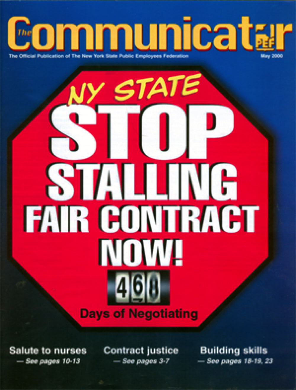 PEF's representatives believed that because their union, for more than a year, had been aggressively challenging the governor in support of fair contracts for all state workers that the Pataki Administration was bent on punishing them and dragging out contract negotiations indefinitely. The May 2000 cover of The Communicator was an illustration of a stop sign which read: "NY State — STOP STALLING — FAIR CONTRACT NOW!" Below the slogan was an odometer reading "468 Days of Negotiating."