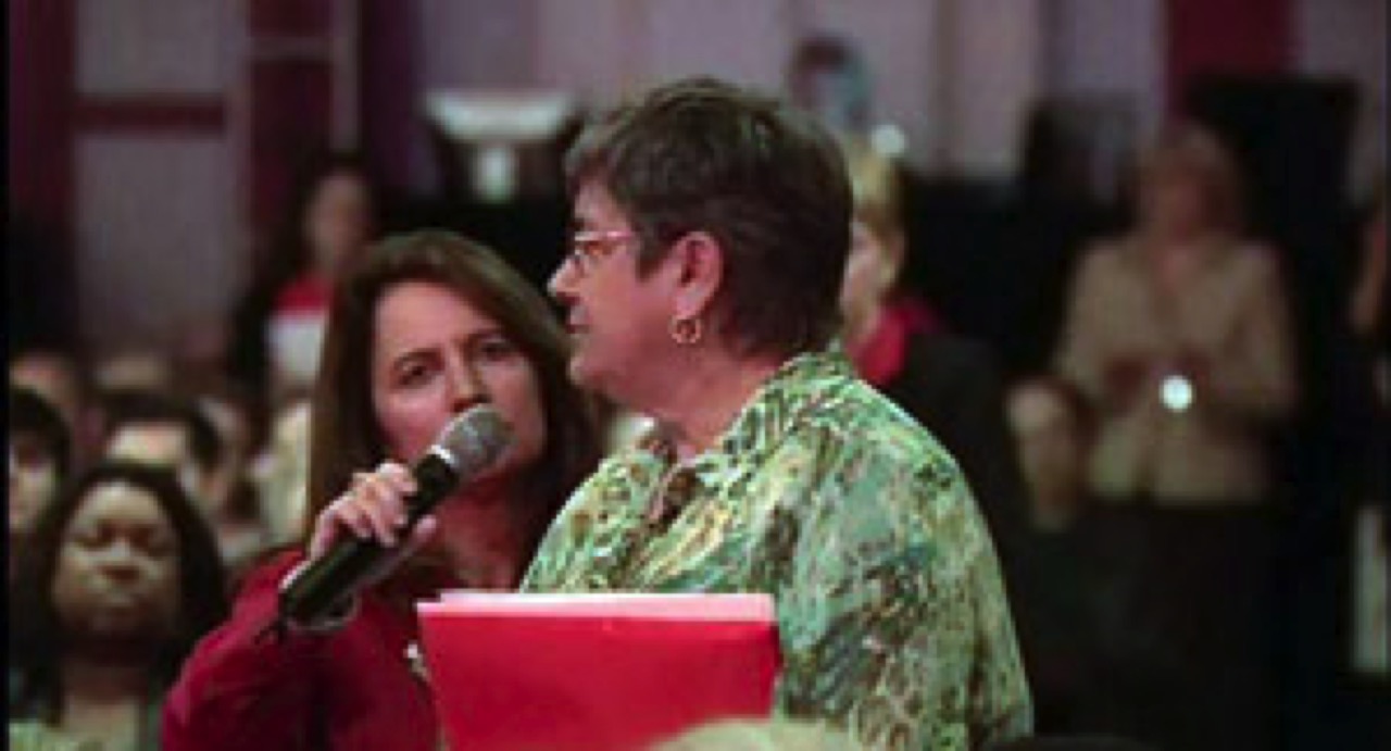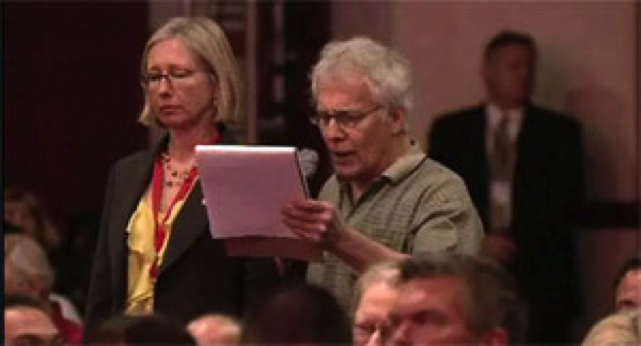 Coke's CEO, Muhtar Kent (top left), is questioned by Campaign supporters Ray Rogers (top right), Lewis Friedman (row two, left) and Jeffrey Wright (row two, right) and Campaign supporters Diane Mathiowitz (row three, left) and Betty Martini (row three, right). The Campaign was supported outside by the mobile truck which circled the meeting as well as the city of Atlanta.